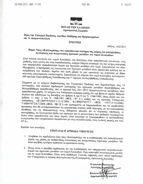 Σήμερα ξεκίνησε με τις αρμοδιότητες του δημοσιοποιώντας σχετική ερώτηση που υπέβαλε στην Βουλή για το θέμα των συγχωνεύσεων σχολικών μονάδων που συζητά το υπουργείο Παιδείας αυτή την εποχή. Ακολουθεί το σχετικό κείμενο:
