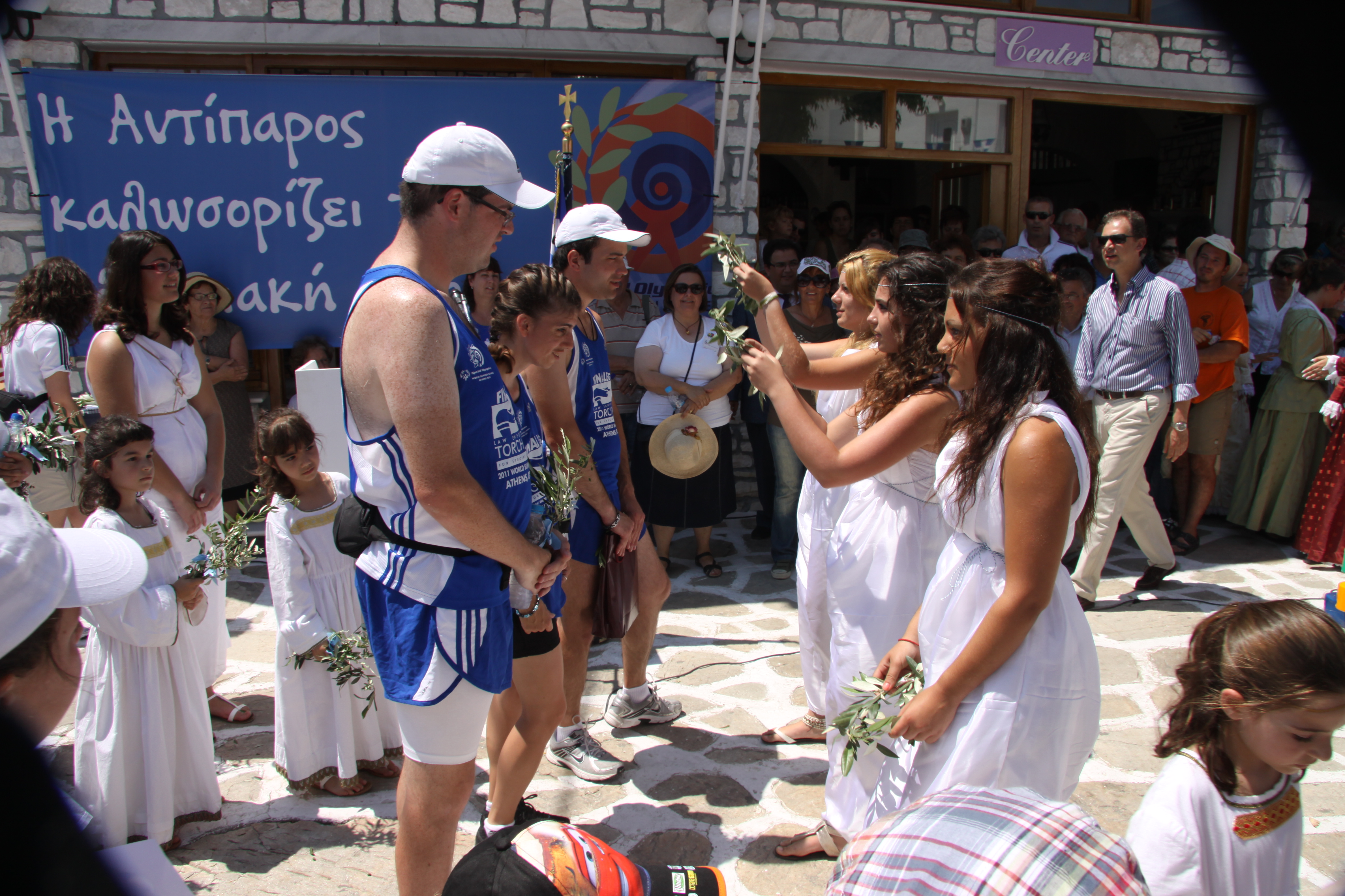 Η Φλόγα με την αποστολή, που αποτελούνταν από 46 αθλητές και συνοδούς και καλύφθηκε τηλεοπτικά και δημοσιογραφικά, έφθασε στο λιμάνι της Αντιπάρου στις 11 το πρωί με ειδικό δρομολόγιο του ferry boat, το οποίο πλαισίωναν ψαροκάικα του νησιού και τα σκάφη του τοπικού Ναυτικού Ομίλου.