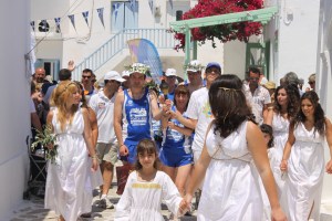 Ακολούθησαν παραδοσιακοί χοροί από το χορευτικό συγκρότημα του Δήμου. Στη συνέχεια ακολουθώντας την ίδια διαδρομή κατευθύνθηκαν προς το λιμάνι όπου τους παρατέθηκε γεύμα σε ταβέρνα του νησιού και στις 2:30 αναχώρησαν για να συνεχίσουν το ταξίδι τους στην Πάρο και την υπόλοιπη Ελλάδα. Πιστεύουμε η ολιγόωρη παραμονή τους στο νησί μας να ήταν αρκετή έτσι ώστε να γίνουν δέκτες των παραδόσεων μας , της ομορφιάς του γαλάζιου, της οσμής της θάλασσας, της κυκλαδίτικης ζεστής φιλοξενίας και κυρίως του μηνύματος μας που είναι: σεβασμός στη διαφορετικότητα, στην