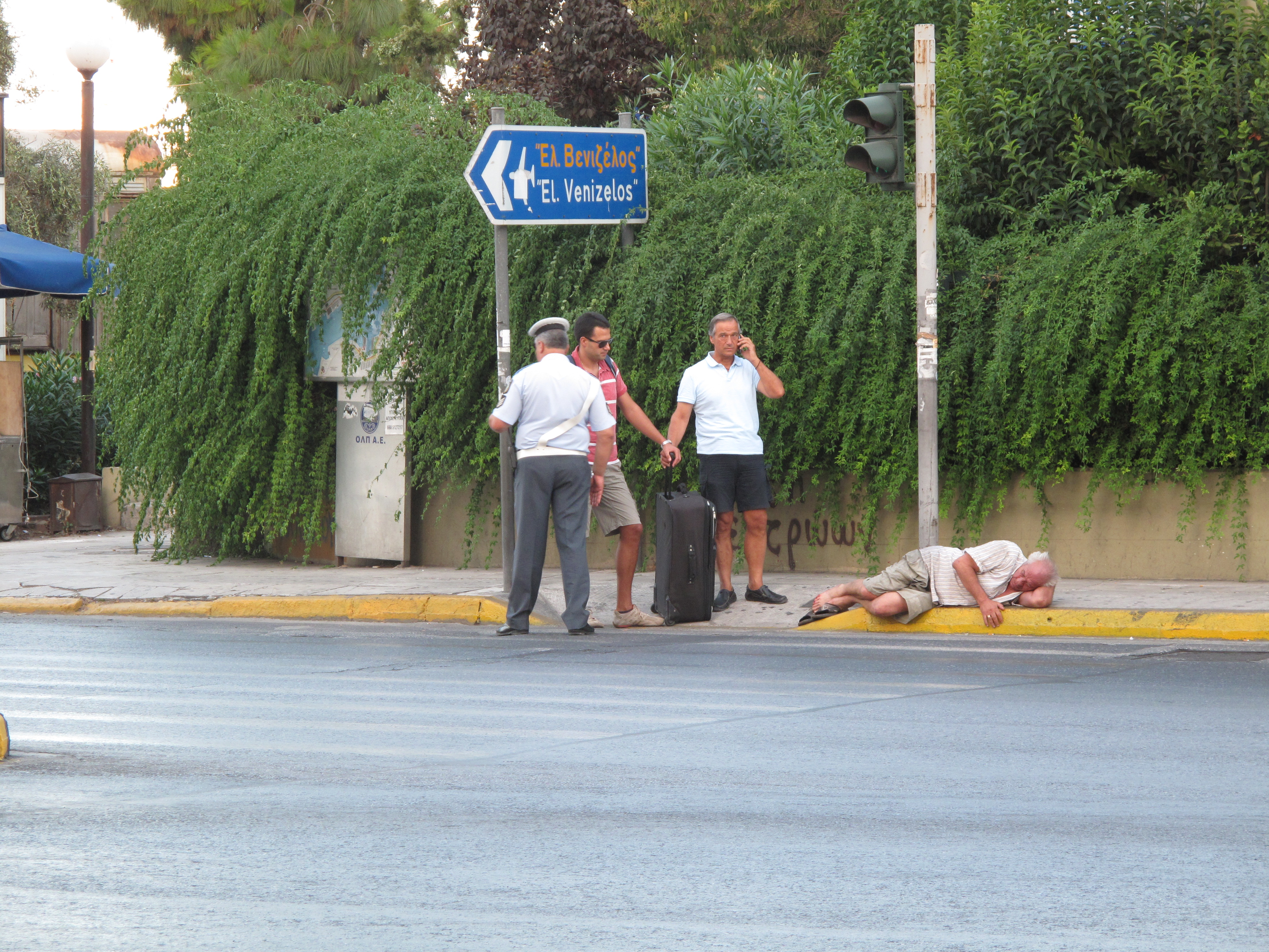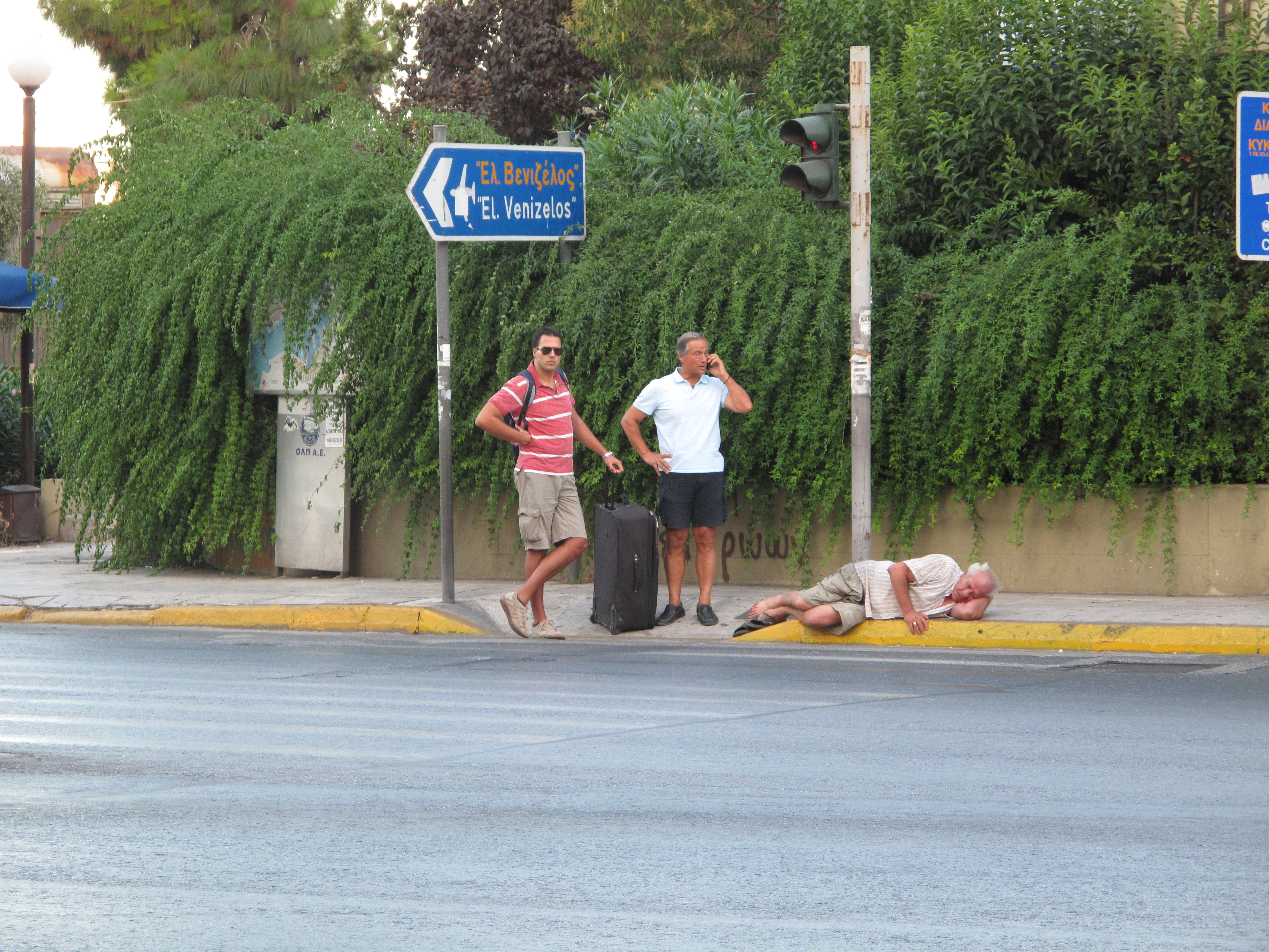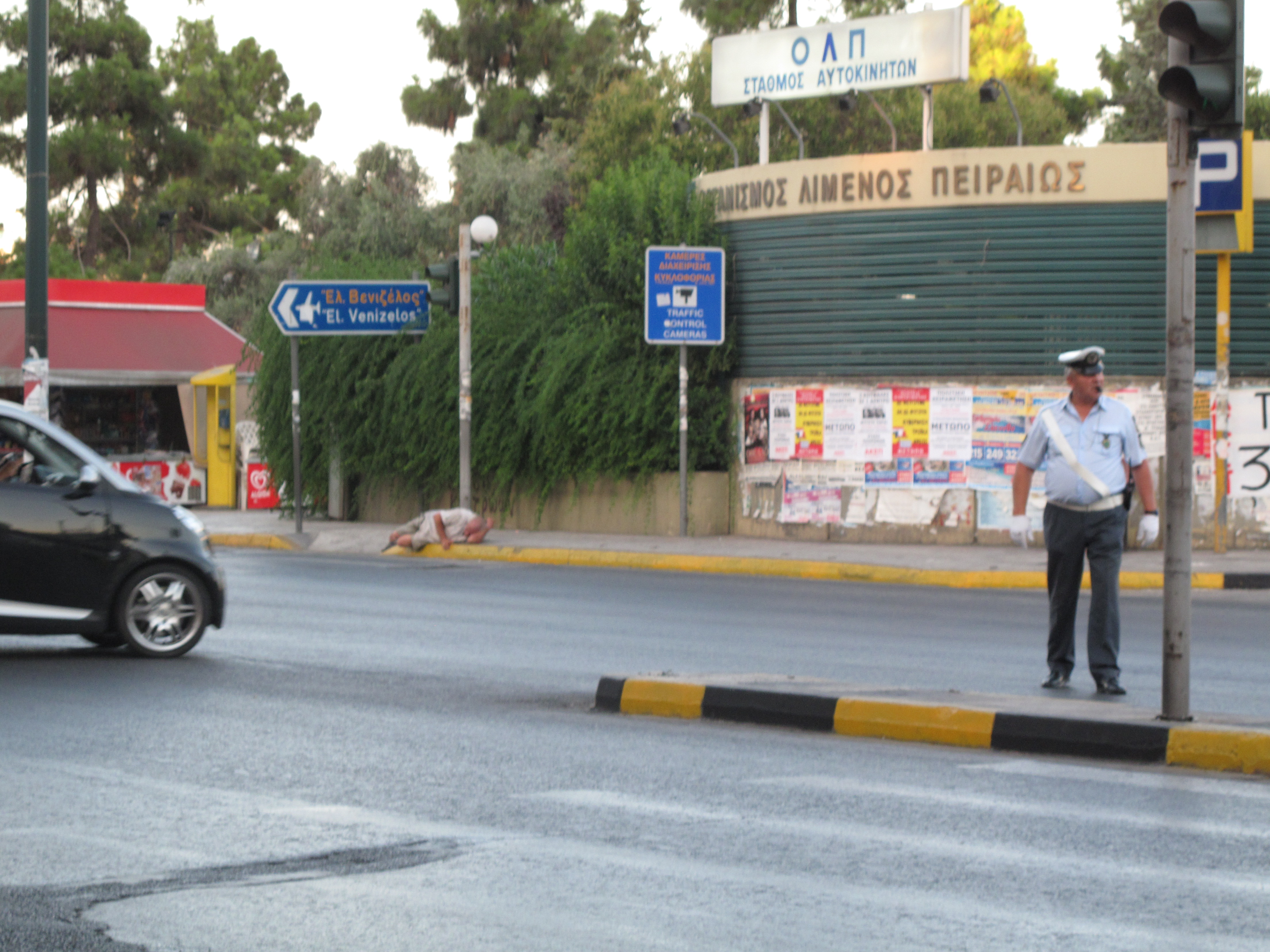 7) Ώσπου, ένας Έλληνας με τον γιό του σταματά στο σημείο, και παίρνει τηλέφωνο στο ΕΚΑΒ για να ενημερώσει για το γεγονός. Νωρίτερα είχε απευθυνθεί στον έμπειρο αστυνομικό που βρισκόταν στη νησίδα του δρόμου (βλέπε φωτογραφία Νο 5) για να του ζητήσει να κάνει κάτι. Εκείνος τού απάντησε «Τι να κάνω; Είναι μεθυσμένος;». Προφανώς η απάντηση δεν ικανοποίησε τον κύριο και πήγε