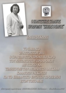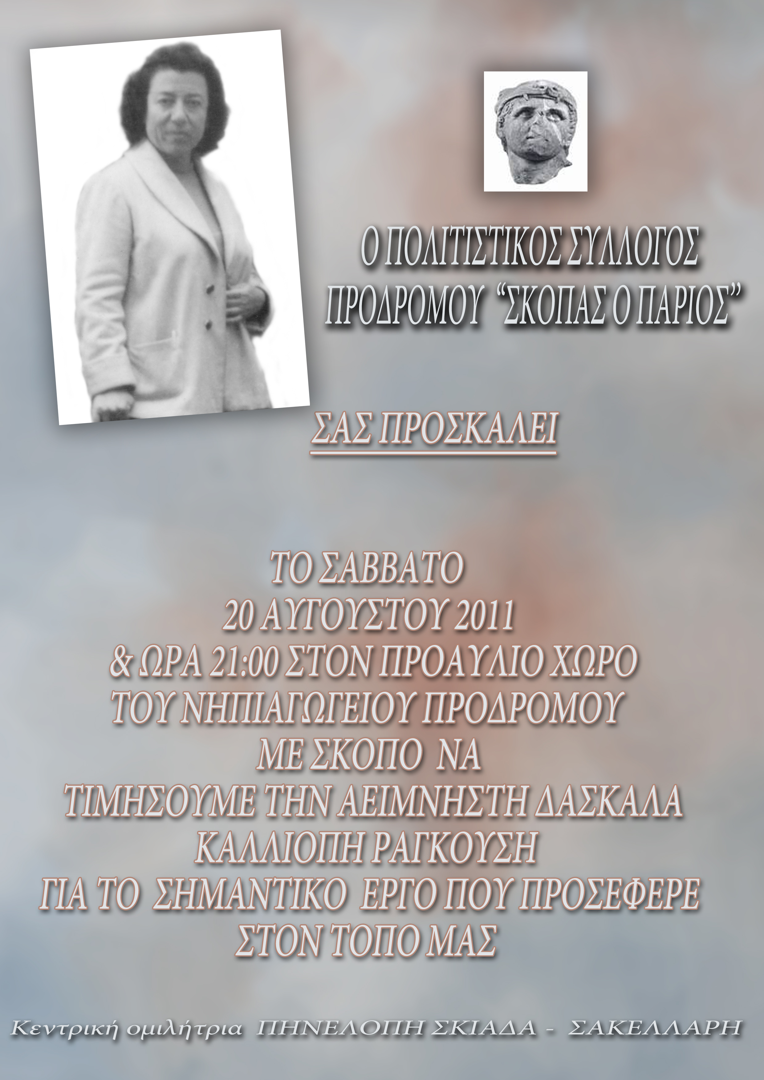 Ο Πολιτιστικός Σύλλογος Προδρόμου «Σκόπας ο Πάριος» προσκαλεί σε εκδήλωση που θα πραγματοποιηθεί το Σάββατο 20 Αυγούστου, στις 21:00 στο προαύλιο του νηπιαγωγείου Προδρόμου. Θα τιμηθεί η μνήμη της δασκάλας Καλλιόπης Ραγκούση για τη σημαντική προσφορά στο χωριό. Κεντρική ομιλήτρια της εκδήλωσης θα είναι η Πηνελόπη Σκιαδά – Σακελάρη.