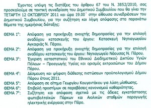 Συνεδρίαση Δημοτικού Συμβουλίου Πάρου στις 12 Οκτωβρίου 2011, τα θέματα της ημερήσιας διάταξης
