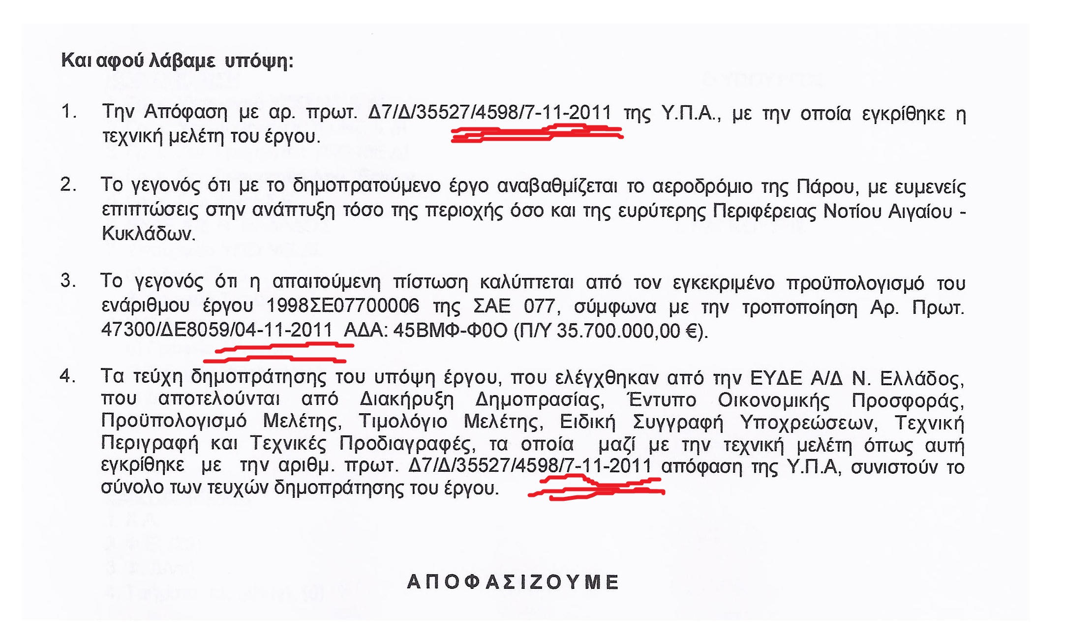 ξαφνικά, υπογράφτηκε από τον Γ. Ραγκούση στις 7 Νοεμρίου 2011, δηλαδή την παραμονή της 8 Νοεμβρίου που παραιτήθηκε ο ίδιος από υπουργός, η διάθεση πίστωσης 23,2 εκ ευρώ, προκειμένου να δημοπρατηθεί το έργο κατασκευής του «Νέου Πεδίου Ελιγμών Κρατικού Αερολιμένα Πάρου».