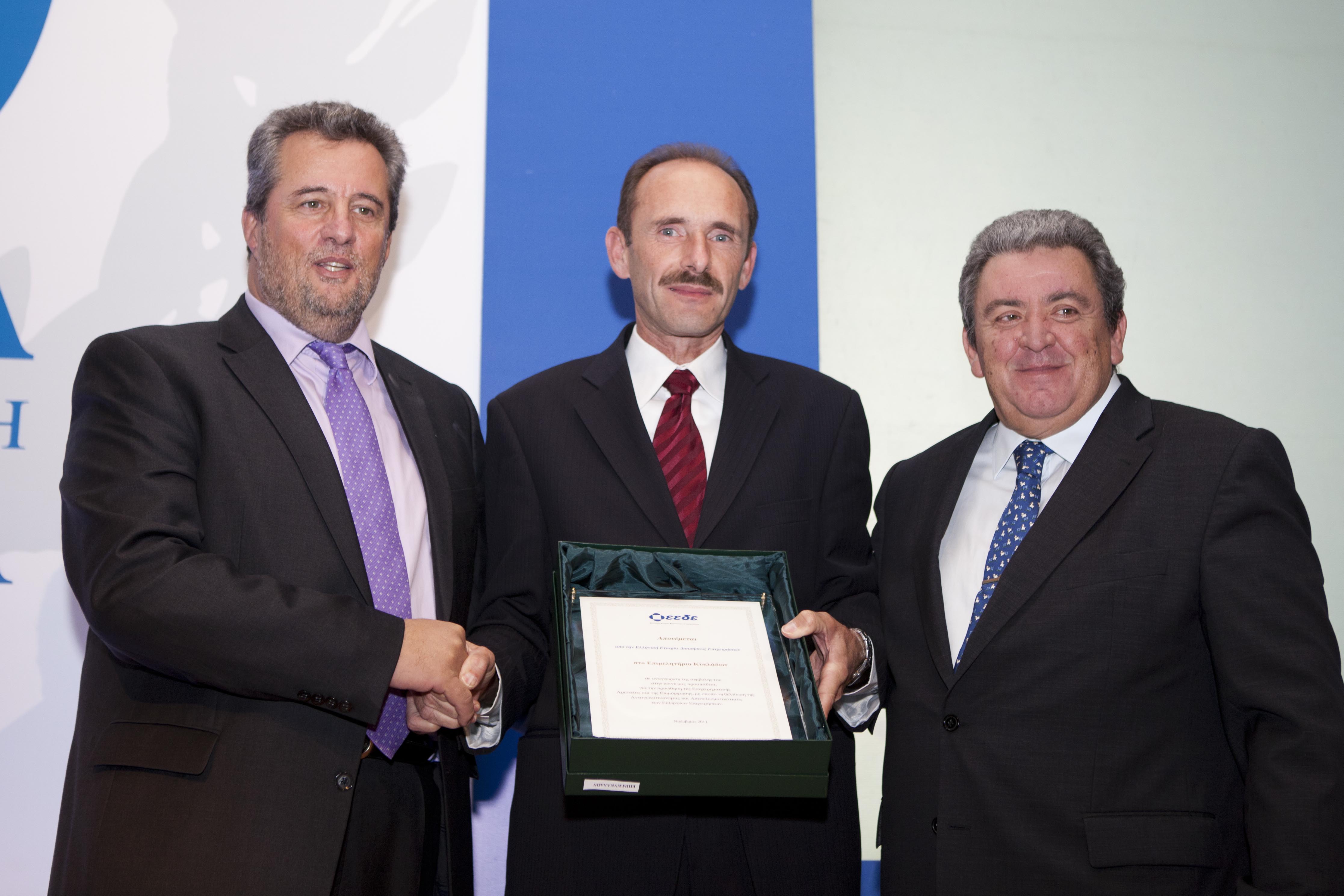 Στο πλαίσιο της εορταστικής διοργάνωσης για τα 10 χρόνια του θεσμού της Επιχειρηματικής Αριστείας, που πραγματοποιήθηκε στις 15 Νοεμβρίου στο Μέγαρο Μουσικής Αθηνών, η Ελληνική Εταιρία Διοικήσεως Επιχειρήσεων (Ε.Ε.Δ.Ε.) απένειμε Τιμητική Διάκριση στο Επιμελητήριο Κυκλάδων για τις υπηρεσίες που προσφέρει στα μέλη του, και γενικότερα για τη συμβολή του στην ανάπτυξη της οικονομίας των Κυκλάδων.