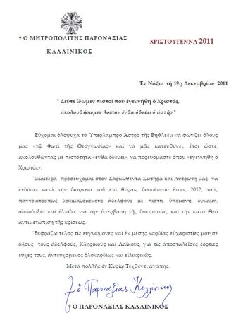 Ὁ Σεβασμιώτατος Μητροπολίτης Παροναξίας κ. Καλλίνικος κατ΄ ἐφαρμογήν τοῦ ὑπ΄ ἀριθμ. πρωτ. 6675/2954/16-11-2011 Ἐγκυκλίου Σημειώματος τῆς Ἱερᾶς Συνόδου πρός τούς Σεβασμιωτάτους Μητροπολίταςτῆς Ἐκκλησίας τῆς Ἑλλάδος, διά τοῦ ὁποίου συνιστᾶ καί προτείνει τήν ἀποφυγήν ἀποστολῆς ἑορτίων εὐχῶν (μέσῳ ταχυδρομείων) λόγῳ τῆς συνεχῶς ἐπιδεινουμένης οἰκονομικῆς κρίσεως, πού πλήττει τόν λαόν μας, δέν θά ἀποστείλει γραπτῶς εὐχάς ἐπ΄ εὐκαιρία τῶν ἑορτῶν τοῦ Ἁγίου Δωδεκαημέρου, εὔχεται ὅμως μέσῳ τοῦ Διαδικτύου μετά βαθυτάτου σεβασμοῦ καί ἀδελφικῆς ἀγάπης πρός στούς Σεβασμιωτάτους Ἀρχιερεῖς τόσον τῆς Ἐκκλησίας τῆς Ἑλλάδος ὅσον καί πασῶν τῶν ἀνάτόν κόσμον Ἁγίων Ὀρθοδόξων Ἐκκλησιῶν ἀλλά καί μετά πολλῆς ἐν Κυρίῳ Τεχθέντι ἀγάπης πρός ἅπαντας τούς ἀγαπητούς ἀδελφούς Κληρικούς καί Λαϊκούς, μέ τό ἐπισυναπτόμενο σύντομο κείμενο.