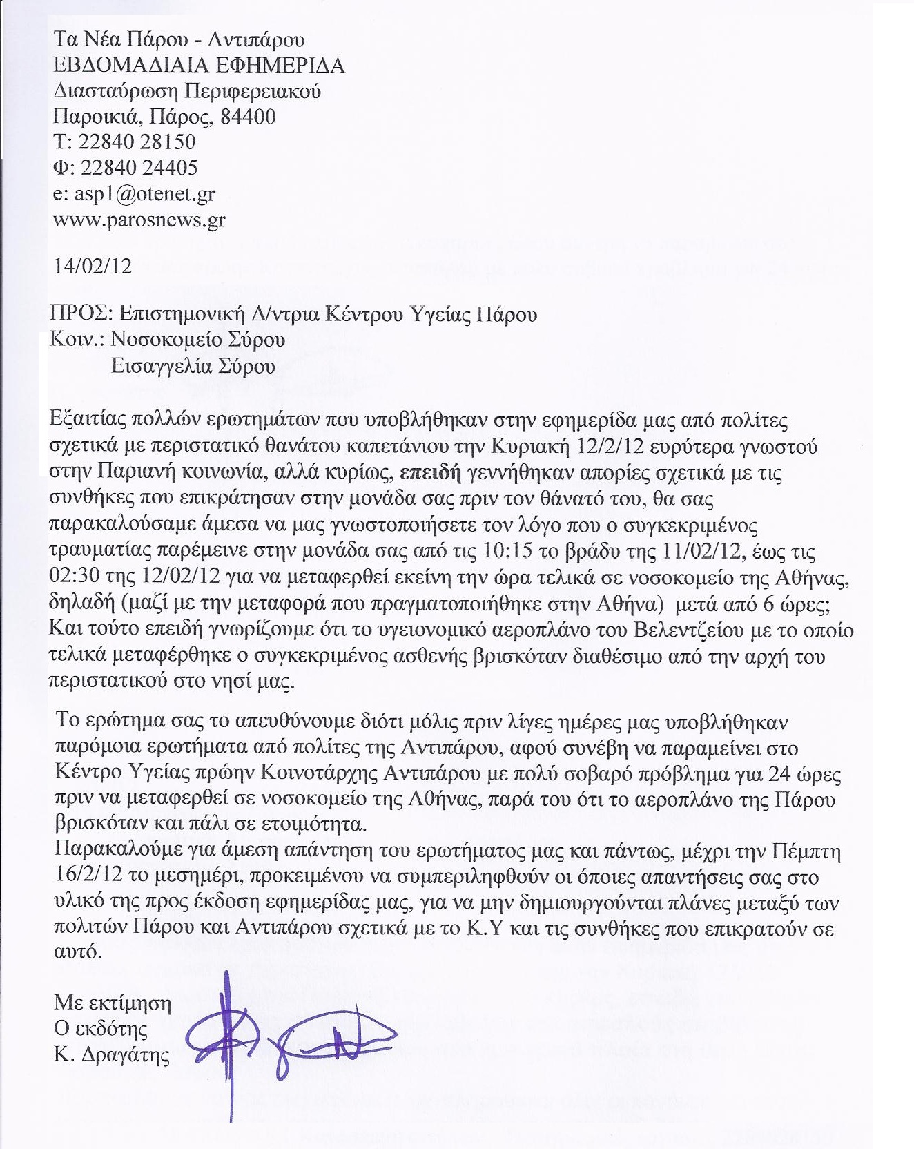 Την ίδια ημέρα η εφημερίδα μας (14/2) υπέβαλε τα παρακάτω ερωτήματα, αφενός στο Κέντρο Υγείας Πάρου, αφετέρου προς το Λιμεναρχείο και το Λιμενικό Ταμείο: