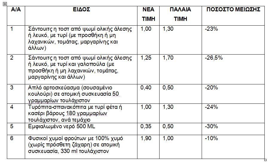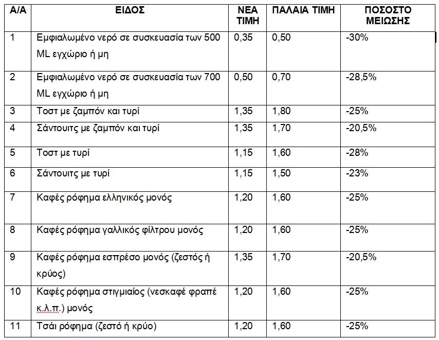 Ύστερα από την έκδοση της αγορανομικής διάταξης με αριθμό 3/2012 του Υπουργείου Ανάπτυξης, Ανταγωνιστικότητας, Υποδομών, Μεταφορών και Δικτύων, Γενική Γραμματεία Εμπορίου, δημοσιεύονται οι παρακάτω πίνακες για να ενημερωθούν οι καταναλωτές και επιχειρηματίες για τις νέες μειωμένες ανώτατες τιμές που προσφέρονται ή παρέχονται από επιχειρήσεις (κυλικεία, αναψυκτήρια, μπαρ, εστιατόρια και άλλα καταστήματα, που δραστηριοποιούνται σε χώρους όπου δεν είναι δυνατόν να λειτουργεί ανταγωνισμός, όπως πλοία, σχολικές καντίνες, καντίνες γηπέδων κλπ).