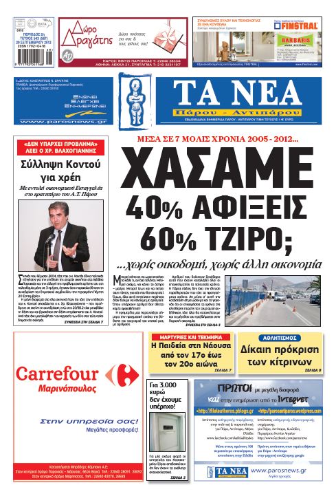 e-mail: asp1@otenet.gr Ιστότοπος Τα Νέα Πάρου - Αντιπάρου Μ.: 6977 695669 Από τη διασταύρωση Περιφερειακού 300 μ. στην πάροδο προς Καμάρες Παροικιά | Πάρος Εκδόσεις Τυπογραφικές Εργασίες Διαφήμιση ΑΣΠΑΛΑΘΟΣ