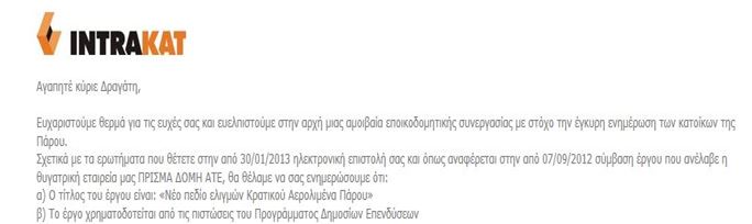 Ευχαριστούµε θερµά για τις ευχές σας και ευελπιστούµε στην αρχή µιας αµοιβαία εποικοδοµητικής συνεργασίας µε στόχο την έγκυρη ενηµέρωση των κατοίκων της Πάρου. Σχετικά µε τα ερωτήµατα που θέτετε στην από 30/01/2013 ηλεκτρονική επιστολή σας και όπως αναφέρεται στην από 07/09/2012 σύµβαση έργου που ανέλαβε η θυγατρική εταιρεία µας ΠΡΙΣΜΑ ΔΟΜΗ ΑΤΕ, θα θέλαµε να σας ενηµερώσουµε ότι: