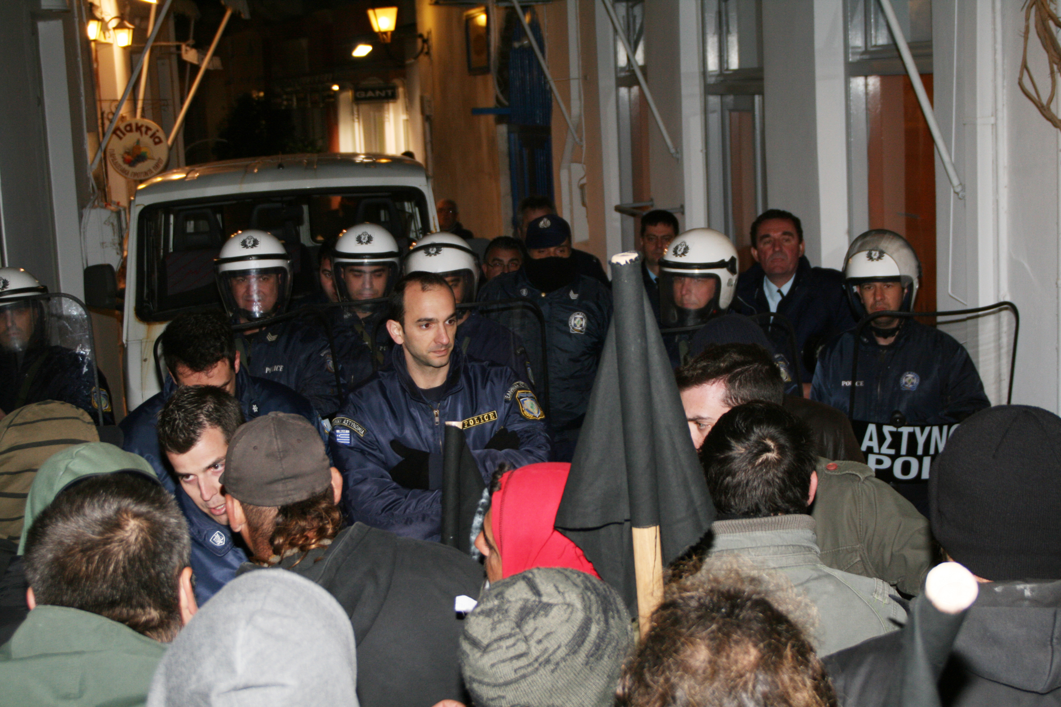 Το τοπικό αστυνοµικό τµήµα προσπάθησε να διαχειριστεί ένα φορτίο µεγάλο για τα αποδυναµωµένα – λόγω µνηµονίου – µέτρα του. Οι αστυνοµικοί του ήταν σοβαροί και προσπάθησαν να διαχειριστούν την κρίση µε µέτρο και σύνεση. Όµως τον πρώτο λόγο τον είχαν οι δυνάµεις από την Αθήνα. Και το τελευταίο µέλος αυτών των δυνάµεων δρούσε ανεξέλεγκτα, δεν υπάκουε καν σε εντολές ανωτέρων, προκαλούσαν και έβριζαν όποιον ήταν νέος, φορούσε φόρµα ή είχε µακριά µαλλιά. Έτσι, έγιναν και τα πρώτα επεισόδια µόλις στις 5 η ώρα το απόγευµα, πριν καν τη συγκέντρωση. Στο στενάκι της ALPHA BANK ένας άνδρας των ΜΑΤ έβρισε δύο παιδιά 18 ετών και όταν του απάντησαν προσπάθησε να συλλάβει τον έναν τραβώντας τον. Όµως γλίστρησε και τα παιδιά ξέφυγαν µε τη βοήθεια και των πρώτων διαδηλωτών που έτρεξαν αµέσως να τα βοηθήσουν. Στο σηµείο έτρεξαν για υποστήριξη του άνδρα των ΜΑΤ συνάδελφοί του και έτσι έγινε µία πρώτη αντιπαράθεση η οποία λίγο έλλειψε να οδηγήσει σε πρόωρα επεισόδια. Όµως ακόµα είχε φως ηµέρας, στο σηµείο τυχαία βρέθηκε ο εκδότης της εφηµερίδας µας µε κάµερα, καθώς και ο φωτογράφος µας Robert van der Most. Με δεδοµένο ότι οι κάµερες έγραφαν, όµορφα και καθαρά, ο αρχηγός της διµοιρίας διέταξε υποχώρηση.
