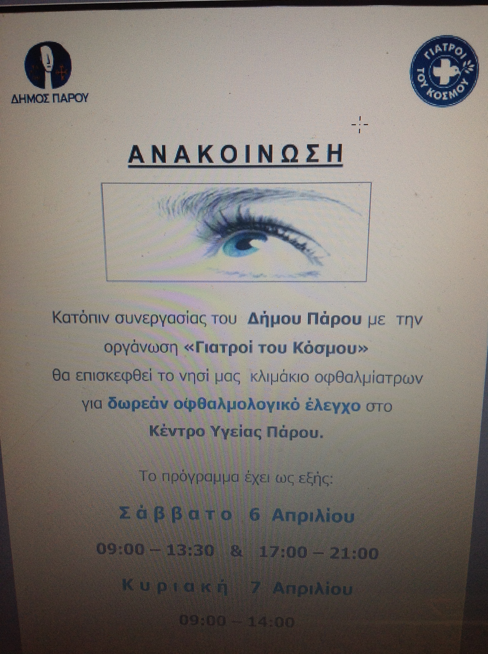 Επίσης τις ίδιες ημέρες και ώρες θα βρίσκεται οφθαλμίατρος στο Κέντρο Υγείας Πάρου».