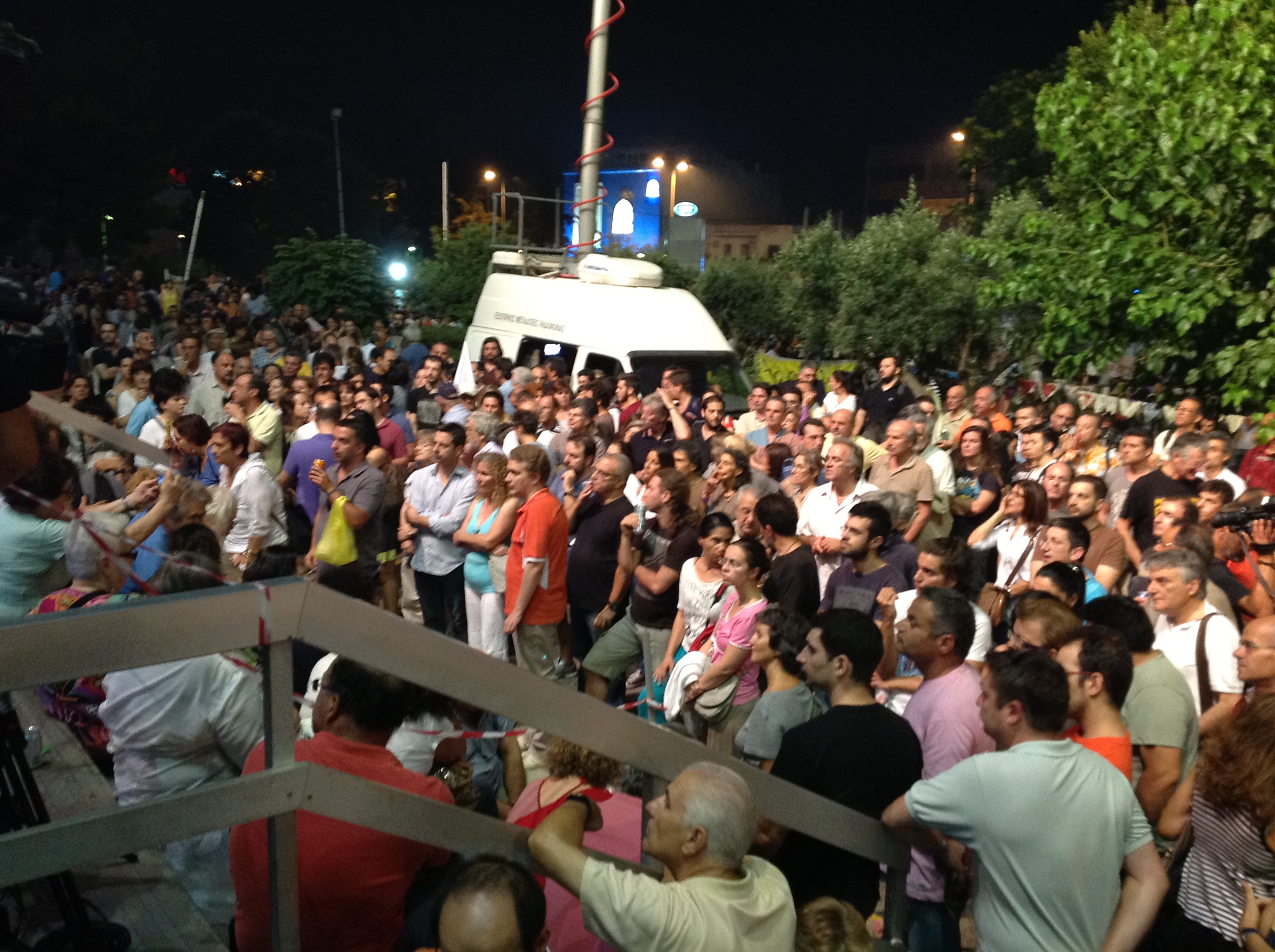 Χιλιάδες κόσμου βρίσκονται στο κτίριο της ΕΡΤ σήμερα βράδυ της 17 προς 18|6 με σκοπό να περιφρουρηθεί το δικαίωμα στην εργασία των εργαζόμενων σε αυτή και το δικαίωμα των Ελλήνων για να συνεχίσει να λειτουργεί η ΕΡΤ ως δημόσια ραδιοτηλεόραση και κέντρο του ελληνικού πολιτισμού στις εγχώριες και διεθνείς συχνότητες.
