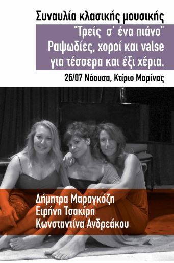 Η Κ.Δ.Ε.Π.Α.Π. σας προσκαλεί σε μια συναυλία κλασικής μουσικής με τίτλο: «Τρεις σε ένα πιάνο», με τις Δήμητρα Μαραγκόζη, Ειρήνη Τσακίρη και Κωνσταντίνα Ανδρεάκου. Ραψωδίες, χοροί, βάλς, για τέσσερα ή έξι χέρια παρουσιάζονται από τις τρεις πινίστριες.