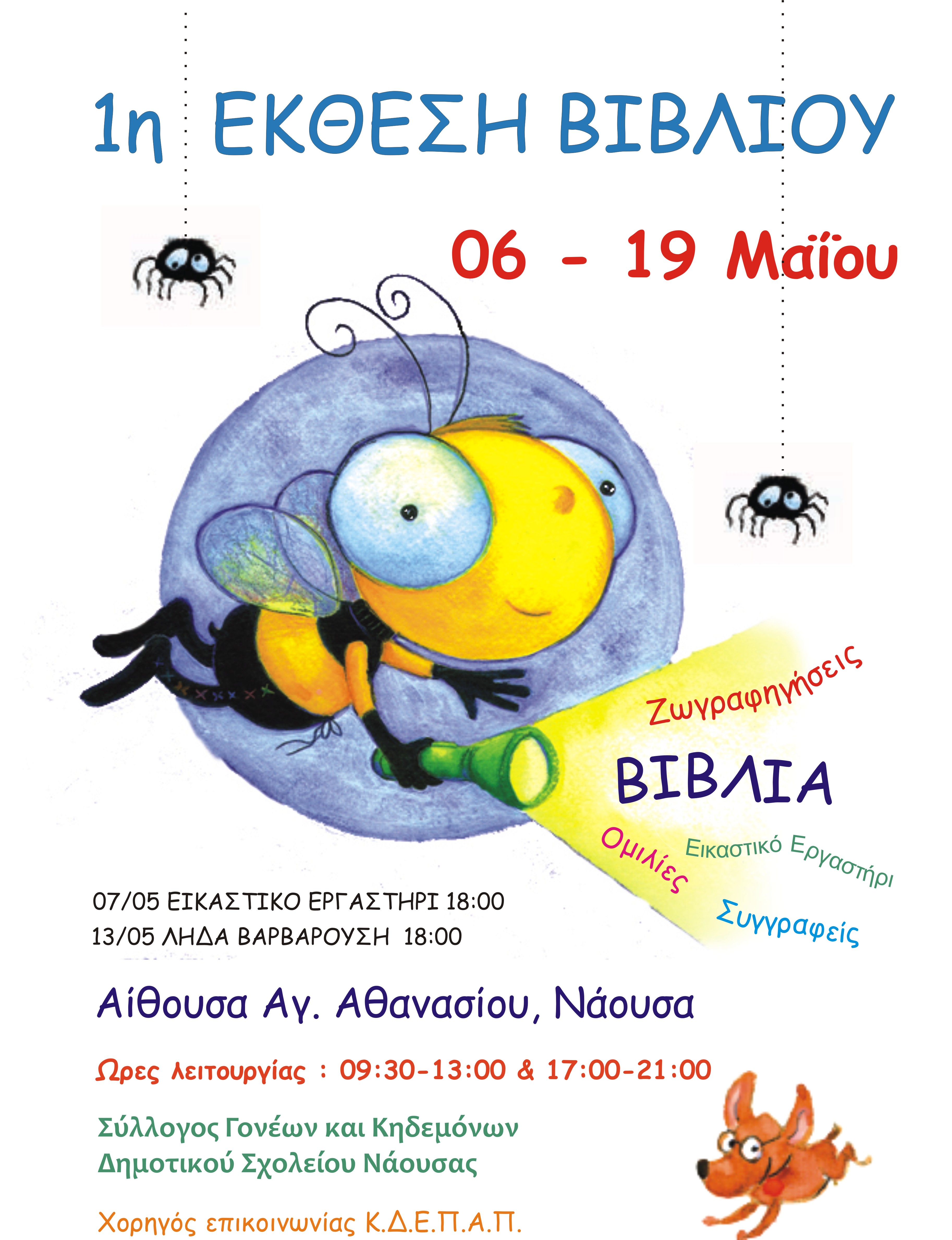 Ο ΣΥΛΛΟΓΟΣ Γονέων & Κηδεμόνων του Δημοτικού Σχολείου Νάουσας προσκαλεί στην 4η ΕΚΘΕΣΗ ΒΙΒΛΙΟΥ, από 1 έως 11 Μαΐου στο Χώρο Τέχνης του Αγ. Αθανασίου στη Νάουσα. ακολουθεί το σχετικό πρόγραμμα: