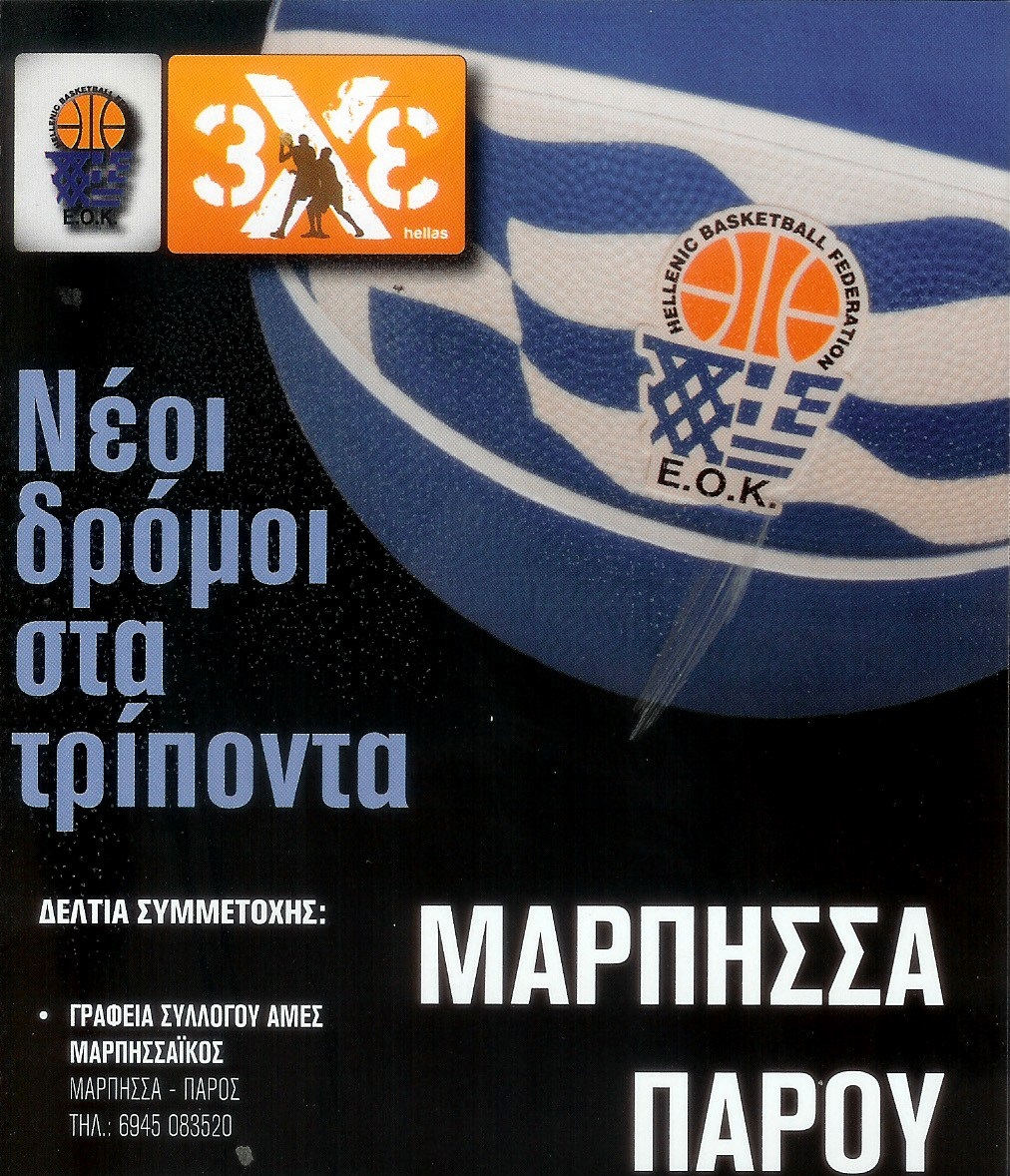 Ο ΑΜΕΣ Μαρπησσαικός σε συνεργασία με την Ελληνική Ομοσπονδία Καλαθοσφαίρισης, το Δήμο Πάρου και την Ε.Σ.Κ.Κ. διοργανώνει τουρνουά 3 με 3 στις 10-11 Μαΐου στο Δημοτικό σχολείο Αρχιλόχου – Μάρπησσας.