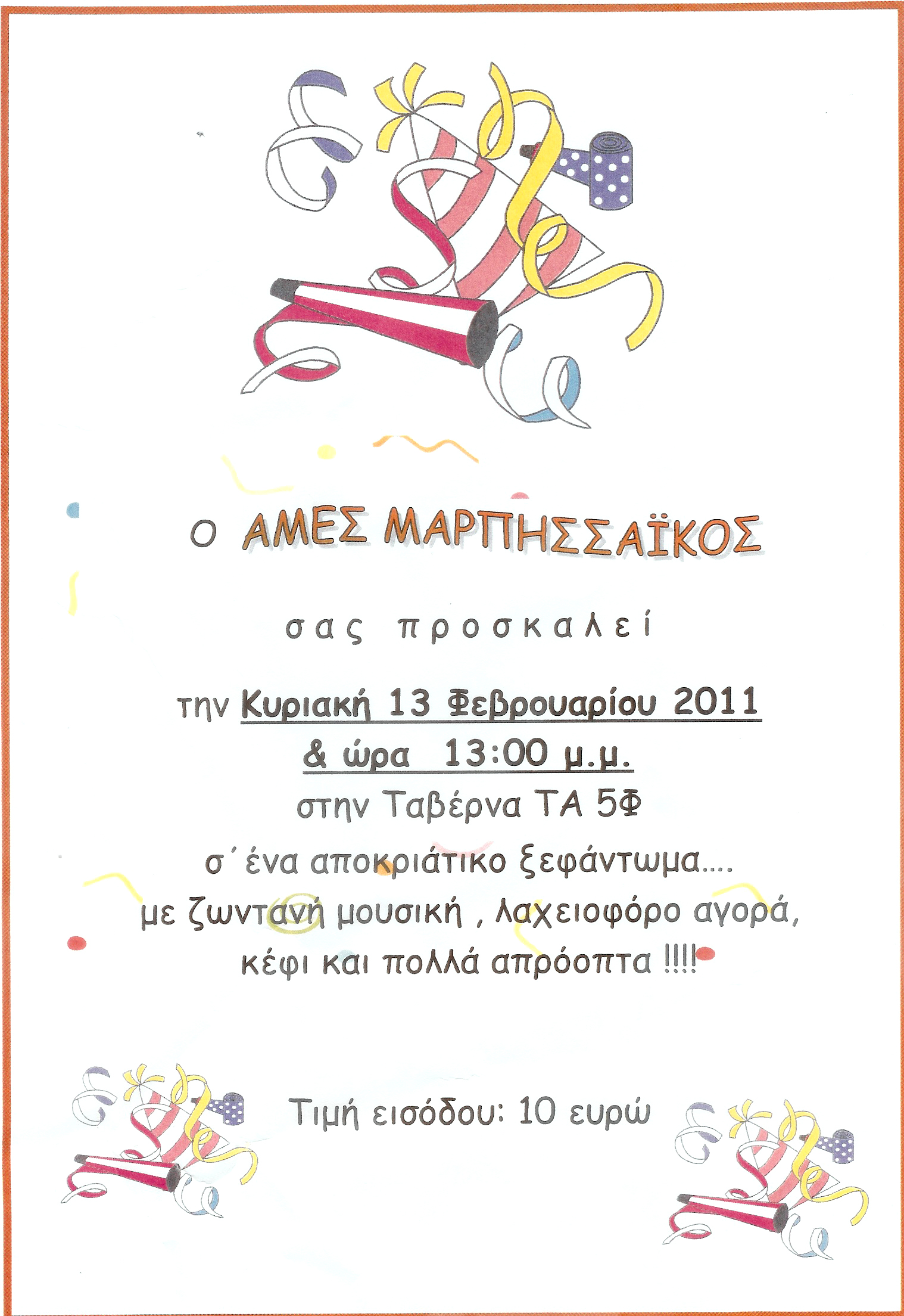 Σας περιμένουμε να περάσουμε μία όμορφη αποκριάτικη βραδιά σε φιλικό και ζεστό περιβάλλον, στο κέντρο «Υστέρνι» την Τσικνοπέμπτη 24 Φεβρουαρίου 2011 από τις 9.00 το βράδυ. Με την πρόσκληση εισόδου θα κληρωθεί για εσάς ένα δώρο έκπληξη. ΔΕΝ θα υπάρξει λαχειοφόρος αγορά.