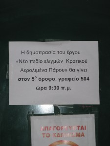 Σήμερα Τρίτη 24 Ιανουαρίου στις 9:30 άνοιξε το γραφείο της η υπηρεσία του ΥΠΕΧΩΔΕ με το όνομα ΕΥΔΕ Αεροδρομίων Νοτίου Ελλάδας και υποδέχτηκε τους εκπροσώπους τελικά 10 από 40 εταιρείες που είχαν εκδηλώσει αρχικά ενδιαφέρον για να συμμετάσχουν στον διαγωνισμό για την κατασκευή του πεδίου ελιγμών του νέου αεροδρομίου Πάρου.