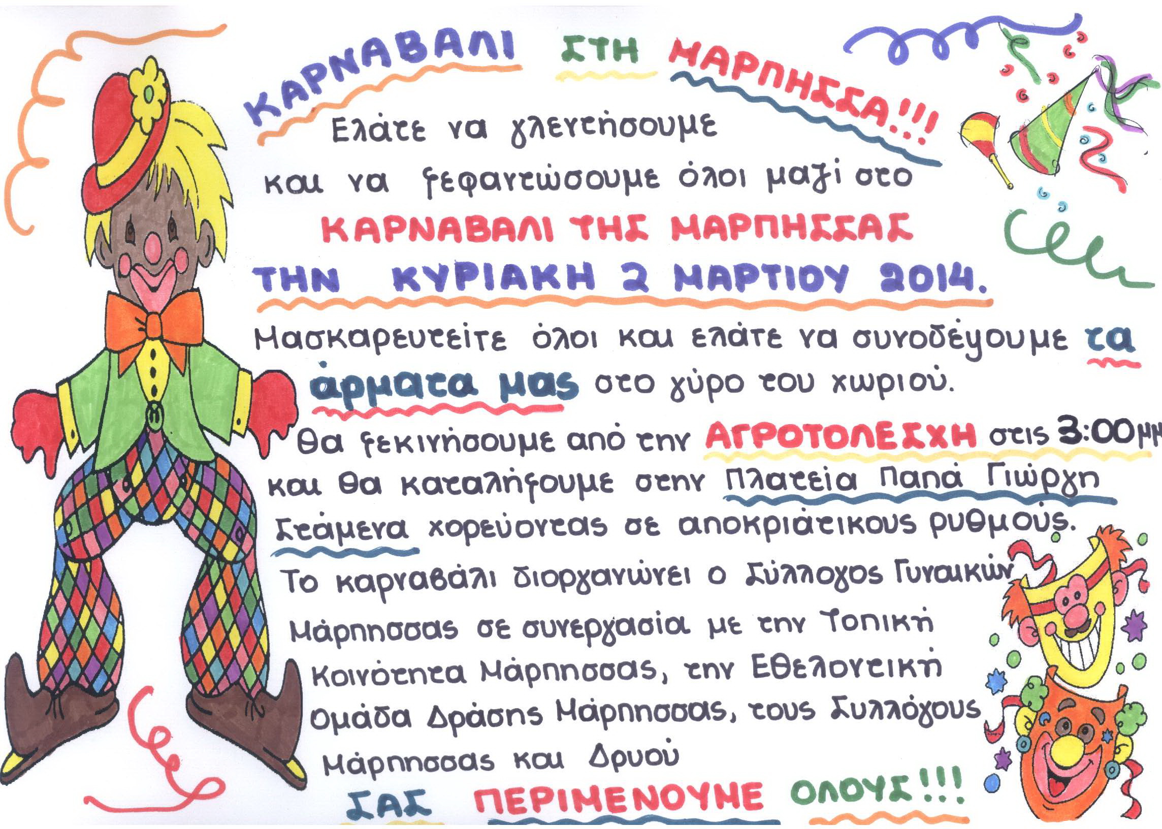 Την Κυριακή 17|3 θα πραγματοποιηθεί το καρναβάλι Μάρπησσας. Από τους διοργανωτές το ραντεβού έχει δοθεί για τις 14:00 έξω από την Αγροτολέσχη. Το πάρτυ θα καταλήξει στην πλατεία Χριστού. Καλούνται όλοι μασκαρεμένοι να δώσουν το παρόν από την τοπική κοινότητα και το Σύλλογο Γυναικών του χωριού.