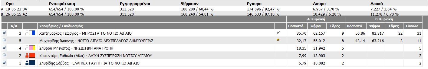 Ο υποκρυπτόμενος νεοδημοκράτης υποψήφιος που δήλωνε από ανεξάρτητος μέχρι και αντιμνημονιακός κατά την προεκλογική περίοδο, Γ. Χατζημάρκος, ορμώμενος από τη Δωδεκάνησο κέρδισε τις εκλογές στην Περιφέρεια Νοτίου Αιγαίου.