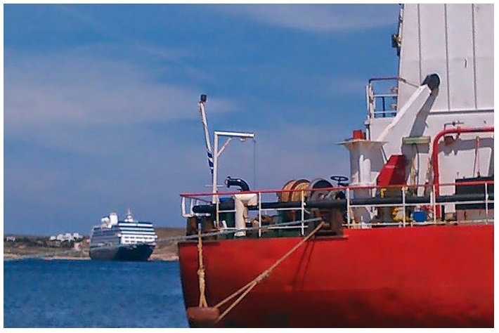 Το χειρότερο όμως είναι ότι το έστω και το ένα κρουαζιερόπλοιο, η δημοτική αρχή Χρ. Βλαχογιάννη το υποδέχτηκε – επί της ουσίας – με ένα πολύ ωραίο φορτηγό πλοίο να «στολίζει» ανθρώπους και μαγαζιά. Εικόνα που στη συνέχεια προσπάθησε να εξαφανίσει η δημοτική αρχή. Το στιγμιότυπο «συνέλαβε» όμως η κάμερα του παραταξιακού ιστότοπου «Παριανός Δρόμος» από όπου παραθέτουμε τη φωτογραφία.